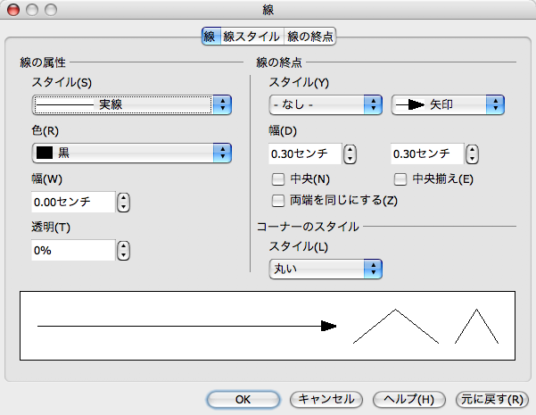 また,一度描いた矢印であっても,右クリックから表示されるプロパティ編集メニューより,「線」を選択すると表示される以下のダイアログできめ細かく設定変更できる.